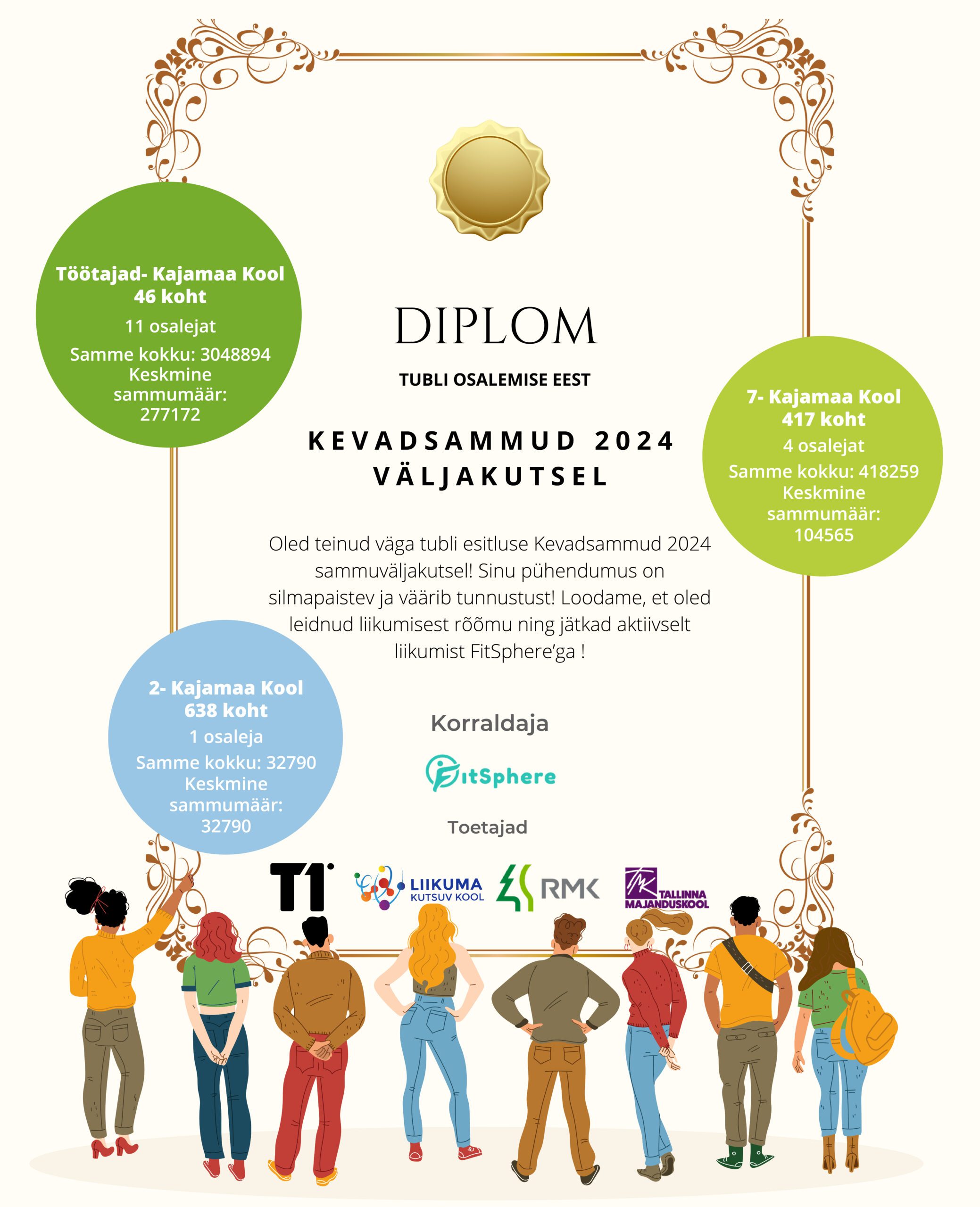 FitSphere äpi “Kevadsammud 2024” on selleks aastaks lõppenud. Kajamaa Kooli leidis üldkokkuvõttes kolmest võistkonnast, osalejaid koolist kokku 16 liiget. Võistkond “Töötajad-Kajamaa Kool” saavutas 46 koha, “7-Kajamaa Kool” 417 koha ja kõige hiljem liitunud “2-Kajamaa Kool” 638 koha. Aprillikuu jooksul sammusime kolme võistkonna peale kokku 3499943 sammu. Kokku osales 706 võistkonda üle Eesti.