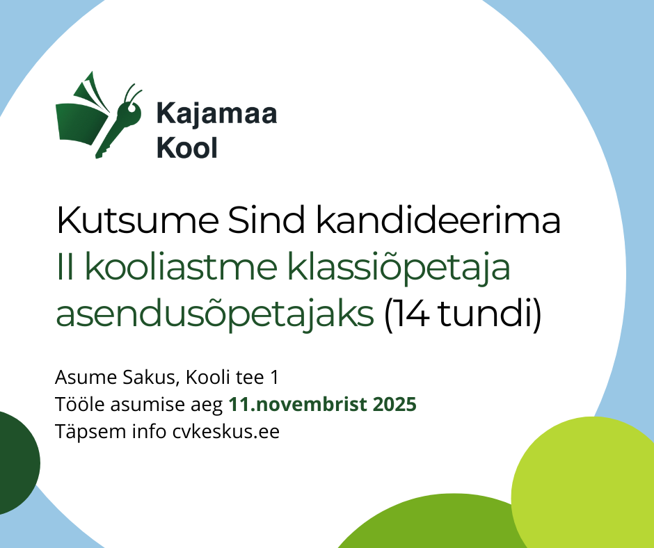 Kajamaa Kool otsib sõbralikku, hoolivat ja vastutustundlikku asendusõpetajat, kes asendaks meie pühendunud põhiõpetajat tööajaks kuni tema naasmiseni.