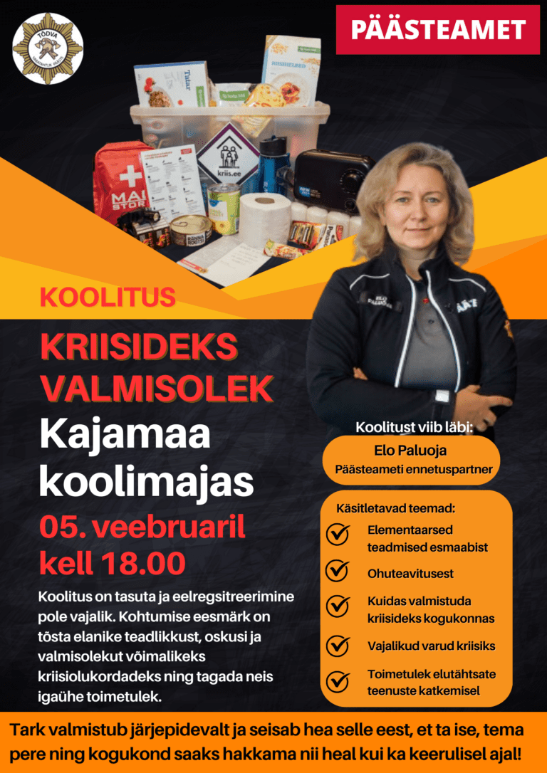 Kajamaa koolimajas toimub 5.veebruaril 18.00 koolitus “Kriisideks valmisolek” Koolitust viib läbi Päästeameti ennetuspartner Elo Paluoja, kohal on ka Tõdva Vabatahtlik pääste.