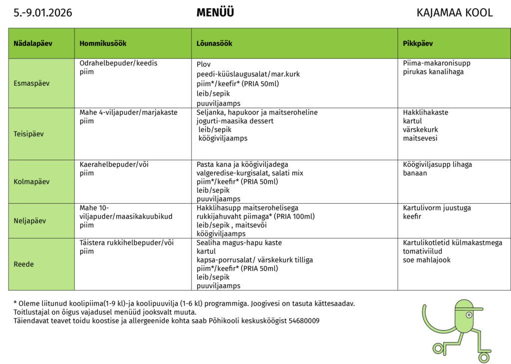 5. kooli personali lõunasöögi maksumus 2,00 eurot;